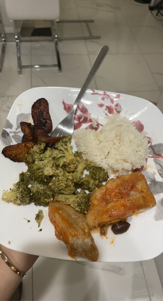 - About half a cup of white rice, fish, broccoli, fried plantains.