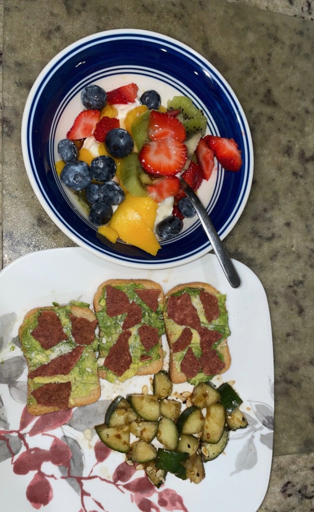 - Three little toasts with avocado, parmesan cheese, turkey bacon, and cucumbers mixed with soy sauce and everything bagel seasoning (really recommend).